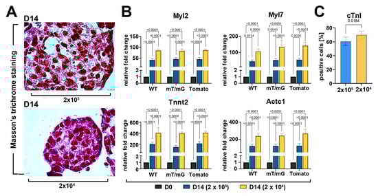 Based on Masson’s trichrome staining, we then evaluated whether cell seeding number modulated muscle cell density and fiber formation in CSs. An increased amount of muscle cells and fibers at D14 was observed in the 2 × 104 seeded cells as compared to the 2 × 105 seeded cells group (Figure 5A). Moreover, we analyzed the mRNA expression level of cardiac-related genes in higher and lower cell seeding conditions at D14 as compared to D0. We detected ~two-fold higher expression levels of Tnnt2, Actc1, Myl7, and Myl2 in cardiac spheroids derived from 2 × 104 seeded cells collected at D14 of the differentiation protocol compared to cardiac spheroids from 2 × 105 seeded cells (Figure 5B). Accordingly, differentiating CSs derived from 2 × 104 seeded cells showed a higher percentage of troponin-positive cells at D14 of the differentiation process when compared to CSs from 2×105 seeded cells (Figure 5C).
