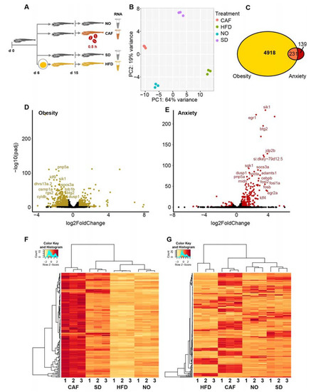 Figure 1. Most anxiety-upregulated larvae transcripts were downregulated in obesity. (A) Experimental design: zebrafish larvae (6 days post-fertilization (dpf)) were fed either a standard diet (SD) or high-fat diet (HFD, based on hard-boiled egg yolk solution). At age 15 dpf, a group of the SD-fed larvae were further divided into caffeine-exposed larvae (CAF) and the controls (non-treated (NO)). Following caffeine exposure (0.5 h) of the CAF larvae, larvae of all treatments were snap-frozen until RNA extraction for RNA-seq. (B) Profiles based on 32,520 Poly(A)+ mapped transcripts clustered according to principal component analysis (PCA) treatment. (C) A total of 231 poly(A)+ transcripts were differentially expressed (DE) (padj < 0.05) in both the obesity (yellow) and anxiety (red) models. (D) Obesity model volcano plot—DE, transcripts color-marked gold; padj < 0.05 and absolute log2 fold change > 0.58 (>1.5 and <0.67-fold change)). Labeled transcripts are among the 107 genes upregulated > 1.5 fold in the anxiety model and downregulated < 0.67 fold in the obesity model. (E) Anxiety model volcano plot—DE, transcripts color-marked red; padj < 0.05 and absolute log2 fold change > 0.58 (>1.5 and <0.67-fold change)). Labeled transcripts are among the 107 genes upregulated > 1.5 fold in the anxiety model and downregulated < 0.67 fold in the obesity model. (F) Heatmap of transcripts per million (TPM) from RSEM of 142 DE poly(A)+ transcripts upregulated in anxiety model (>1.5 fold, padj < 0.05). (G) Heatmap of 182 DE isoform transcripts (FDR < 0.05) that were upregulated > 1.5-fold in the anxiety model and downregulated < 0.67-fold in the obesity model. A total of thirty larvae per replicate, three replicates per treatment.