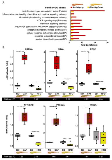 Figure 2. Larval inflammation/immune pathways are upregulated in anxiety and downregulated in obesity. (A) PANTHER Overrepresentation Test identified “CCKR—gastrin- and cholecystokinin-mediated regulation of cellular processes signaling map”, “inflammation mediated by chemokine and cytokine signaling pathway”, and “interleukin signaling pathway”. Reference genes were all those included in the Danio rerio database, Fisher’s exact test, correction by FDR < 0.05. (B) Quantitative reverse transcription polymerase chain reaction (qRT-PCR) results of the anxiety and obesity models are presented as graphs, with RNA-seq results below each graph, n= 6–8 replicates (10–30 larvae/replicate), 2–3 separate experiments, Student’s t-test. Reference genes are the average of eef1a1l1 and actb2. *—p < 0.05, **—p < 0.01, ***—p < 0.001.
