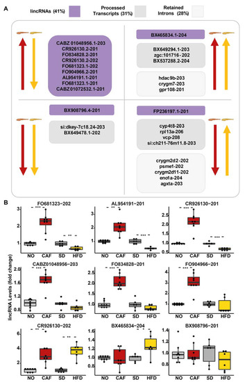 Figure 3. Most differentially expressed (DE) long intergenic noncoding RNAs (lincRNAs) were upregulated in the anxiety model and downregulated in the obesity model, similar to protein-coding genes. (A) Long noncoding RNAs (lncRNAs), classified as long intergenic noncoding RNAs (lincRNA) (purple), processed transcripts (dark grey), and retained introns (light grey) with fold change > 1.5 or <0.66, FDR < 0.05. Arrows pointing upward: upregulation, arrows pointing downward: downregulation. Yellow: obesity model; red: anxiety model. (B) qRT-PCR of lincRNA. N = 5–8 replicates (10–30 larvae/replicate), 2–3 separate experiments. Reference genes: average of eef1a1l1 and actb2. *—p < 0.05, **—p < 0.01, ***—p < 0.001. Student’s t-test.