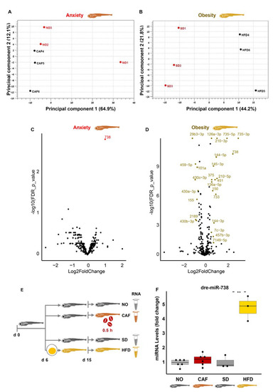 Figure 4. Null involvement of microRNAs (miRNAs) in the anxiety and obesity link in zebrafish larvae. (A,B) PCA graphs of anxiety and obesity, respectively. (C) Volcano plot of anxiety model. Red points: DE in the anxiety model, FDR < 0.05, and absolute log2 fold change > 0.58 (>1.5 and <0.67 fold change). The “dre-miR” prefix has been removed from miRNA labels to enable better visualization. (D) Volcano plot of obesity model. Gold points: DE in the obesity model, FDR < 0.05, and absolute log2 fold change > 0.58 (>1.5 and <0.67 fold change). (E) Experimental design: zebrafish larvae (6 days post-fertilization (dpf)) were fed either the standard diet (SD) or high-fat diet (HFD). At age 15 dpf, a group of the standard diet-fed larvae were further divided into caffeine-exposed larvae (CAF) and the controls (NO). Following caffeine exposure (0.5 h) of the CAF larvae, larvae of all treatments were snap-frozen until RNA extraction for RNA-seq. (F) qRT-PCR of dre-miR-738 in the anxiety and obesity models, Student’s t-test, n = 3–8 (10–30 larvae/replicate, and 1–3 independent experiments, where RNA of one of the experiments had been used in RNA-seq. The reference was the average of three miRNAs: dre-miR-let7a, dre-miR-125b-5p, and dre-miR-26a-5p. **—p < 0.01.