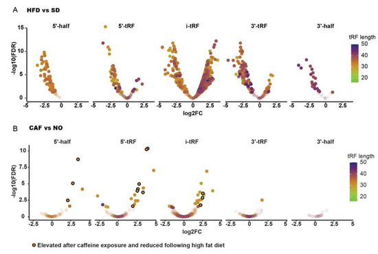 Figure 5. Transfer RNA fragments (tRFs), as well, are inversely regulated in anxiety and obesity. (A) HFD vs. SD. (B) CAF vs. NO. The encircled dots are the 13 tRFs that are upregulated in anxiety and downregulated in obesity.