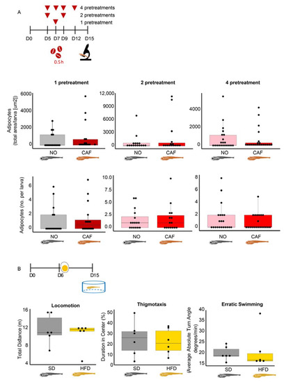 In the experiments examining the effect of anxiety on obesity, the larvae were pretreated with caffeine and assayed for the accumulation of adipocytes on day 15 post-fertilization (pf), as described above. The time of day, concentration, and duration of exposure to caffeine were the same as the other assays, but treatments were performed either on day 7, days 5 and 9, or days 5, 7, 9, and 12 pf, in the one, two, and four caffeine pretreatment experiments, respectively. For the pretreatments, larvae (up to 25) were gently concentrated in 50 mL of water, which was added or not added to a concentrated solution of caffeine. Following the half-hour exposure to caffeine (0 or 100 mg/L), the larvae were gently transferred to their original tank using a 150 µm filter.