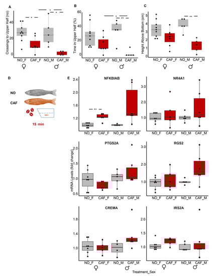 Caffeine induces anxiety-like behavior in both zebrafish larvae [59] and adult fish [60,61]. For the larval anxiety model, we exposed larvae to a one-hour habituation period at 28 °C under light, and subsequently exposed them to caffeine (Sigma, Jerusalem, Israel). Caffeine was added as a concentrated solution to the water (final concentration 100 mg/L) containing larva(e) in wells of plates for 0.5 h at 28 °C between 9:00 a.m. and 12:30 p.m. In behavior tests, we continued caffeine exposure during the tests. In all other assays, groups of larvae, which were held in a Falcon® 70 µm cell strainer (Corning, Glendale, AZ, USA) in the well of a plate, were transferred with the strainer immediately following the caffeine exposure period to ice-cold water for immobilization. Afterward, excess water was removed, and larvae were flash-frozen in liquid nitrogen. The control larvae in this model were manipulated in the same manner as the caffeine-exposed larvae but without caffeine exposure. Adult fish were exposed to caffeine (100 mg/L) for 15 min (before 1:00 pm), the acceptable duration for inducing anxiety-like behavior in adult zebrafish [60,61]. The controls were treated the same as caffeine-exposed adult fish but without caffeine exposure.