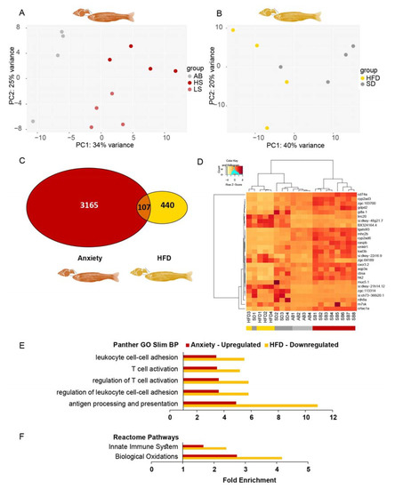 The main goal of this study was to challenge the concept that specific RNA subtypes may link anxiety and obesity and identify related DE transcripts. To date and to the best of our knowledge, no single RNA-seq study has sought both coding and noncoding RNAs (ncRNA), including short regulatory RNAs, that link metabolic disorders with anxiety disorders. Our results surprisingly revealed that immune-related coding and noncoding transcripts that were upregulated in anxious vs. less anxious zebrafish were downregulated in HFD- vs. standard diet (SD)-fed zebrafish; and this inverse regulation was present in both the larval and adult stages.