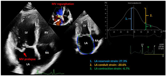 - Cameli, M.; Lisi, M.; Righini, F.M.; Massoni, A.; Natali, B.M.; Focardi, M.; Tacchini, D.; Geyer, A.; Curci, V.; Di Tommaso, C.; et al. Usefulness of atrial deformation analysis to predict left atrial fibrosis and endocardial thickness in patients undergoing mitral valve operations for severe mitral regurgitation secondary to mitral valve prolapse. Am. J. Cardiol. 2013, 111, 595–601. [Google Scholar] [CrossRef]