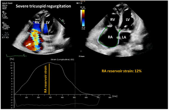 - Teixeira, R.; Monteiro, R.; Garcia, J.; Baptista, R.; Ribeiro, M.; Cardim, N.; Gonçalves, L. The relationship between tricuspid regurgitation severity and right atrial mechanics: A speckle tracking echocardiography study. Int. J. Cardiovasc. Imaging 2015, 31, 1125–1135. [Google Scholar] [CrossRef] [PubMed]