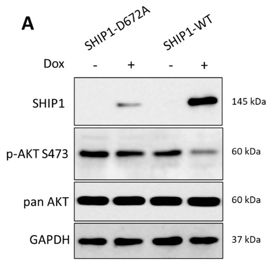 Importantly, even weak expression of wild-type SHIP1 protein in Jurkat cells was still sufficient to significantly reduce the phosphorylation status of AKT at S473 by about 60%, when compared to vector-expressing control cells (Figure 4A,B). In agreement with the reduction in phospho-AKT-S473, cellular growth of the wild-type SHIP1-expressing cells was also substantially reduced in comparison to vector controls and cells transduced with an enzymatically less active SHIP1 mutant (D672A) (Figure 3C). The D672A mutant is based on the D675G murine mutant in which a critical aspartic acid in its catalytic domain was replaced with a glycine, which significantly impairs its enzymatic activity (90% inactive) [45].