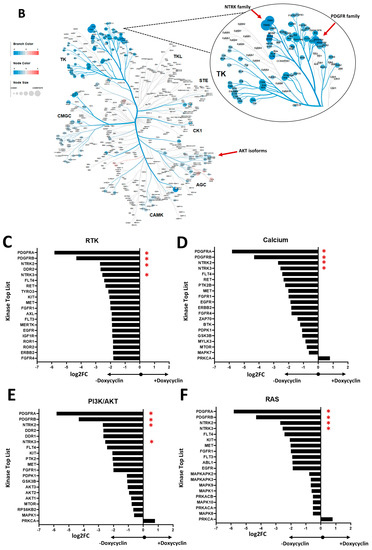 To identify kinases whose activity profile is differentially regulated after restoration of SHIP1 protein expression in Jurkat SHIP1-null T-ALL cells, a doxycycline inducible SHIP1-TetOn expression system (Figure 2A) was used. A kinome tree visualization [44] of the differential kinase activity profile after SHIP1 reconstitution shows that the family of tyrosine kinases (TK) are most affected (Figure 2B). The NTRK and PDGFR subfamilies show the greatest importance for further analysis. In general, the influence of the reconstitution of SHIP1 on the activity profile of serine/threonine- and tyrosine kinases in Jurkat cells showed that SHIP1 reconstitution mainly negatively affects the PI3K/AKT and MAPK signaling pathways, as well as calcium signaling (Figure 2C–F). The differential regulated kinases were consequently grouped according to their classification in known signaling pathways (PI3K/AKT: KEGG hsa04151, MAPK: KEGG hsa04014, and calcium: KEGG hsa04020). PDGFRA/B and NTRK2/3 were not only found in the RTK group, but also in the PI3K/AKT, MAPK and calcium signaling pathway groups (marked with red asterisks), and show the strongest log2 fold change after SHIP1 reconstitution (>2 log2FC).