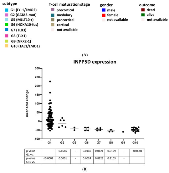 We were interested in whether SHIP1 expression is only downregulated in a specific subgroup of T-ALL. Therefore, we analyzed the gene expression of INPP5D, the genes of the AKT pathway (indicated by red arrows) and the marker genes of the molecular subgroups (indicated by black arrows and the corresponding subgroup number) of T-ALL using the transcriptome data of 106 T-ALL patient samples (Figure 6A) [37]. The available patient samples were arranged according to their subgroup affiliation (G1–G10) defined by [37] for G1, G2, G5, G6, G7, G8, G9 and G10. Unfortunately, no samples for G3 and G4 were available.