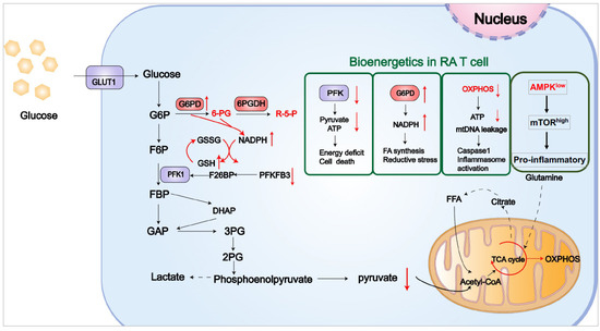 Metabolic adaptations in T cells of RA patients. T cells from RA patients are PFKFB3low and G6PDhigh, shifting the glucose flux from glycolysis into the PPP. Accordingly, these T cells suffer from pyruvate and ATP insufficiency and are sensitive to cell death, while the robust PPP leads to NADPHhigh, facilitating lipogenesis and cell mobility. At the same time, mitochondrial dysfunction in RA T cells drives the release of mtDNA into the cytoplasm, triggering inflammasome-mediated proptosis. In addition, AMPK fails to respond to low ATP in RA T cells, exerting AMPK inactivation and mTOR hyperactivation. The above results can lead topro-inflammatory T cell mal-differentiation in clinical patients.