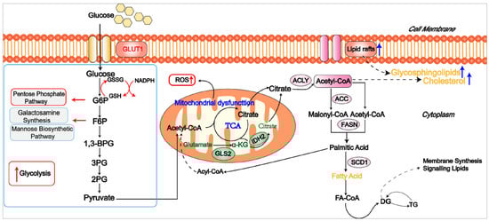 Glucose catabolism can be divided into aerobic oxidation, anaerobic oxidation, and pentose phosphate pathways, depending on the metabolic characteristics and oxygen supply of different types of cells [32]. In aerobic oxidation, glucose is oxidized to pyruvate in sufficient oxygen. The pyruvate is oxidized to acetyl-CoA, which is further oxidized to water and carbon dioxide via the TCA cycle in mitochondria. Another condition is that, in the absence of oxygen, pyruvate is catalyzed by lactate dehydrogenase to produce lactate and 2 moles of ATP, which is known as anaerobic glycolysis. In addition, with insufficient oxygen, some cells still metabolize glucose to pyruvate to produce lactate, known as the Warburg effect [32]. The pentose phosphate pathway (PPP) is a metabolic pathway that branches from glucose-6-phosphate, creating ribose-5-phosphate for generating nucleic acids and nicotinamide adenine dinucleotide phosphate (NADPH) for the production of fatty acids, nucleotides, and nonessential amino acids.