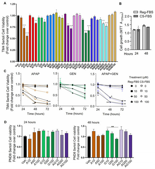 Effects of APAP, IB, GEN, and MEHP on TM4 and PND8 Sertoli cell viability measured by MTT assays. (A) TM4 cell viability after 24 h treatments with vehicle (Veh), APAP (A), IB, GEN (G) or MEHP (M) at 10, 50, and 100 µM, alone or mixed, in 10% Reg-FBS. (B) TM4 cell growth at 24 and 48 h in Reg-FBS (circles) vs. CS-FBS (diamonds) (raw absorbance values). (C) TM4 cell viability in medium containing 10% Reg-FBS (closed symbols) or CS-FBS (opened symbols) up to 72 h. Black: vehicle. Colors indicate treatments. (D) PND8 Sertoli cell viability and proliferation assessed by MTT assay after 24 h and 48 h treatments with vehicle (Veh), APAP (A), GEN (G), or their mixtures (AG) at 10, 50, and 100 µM, in 10% CS-FBS. Data are means ± SEM of three independent experiments (TM4 cells) or two experiments (PND8 Sertoli cells) performed in triplicates. A one-way ANOVA, * p ≤ 0.05; ** p ≤ 0.01; *** p ≤ 0.001.