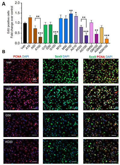 Cell proliferation was further measured in TM4 cells by Click-iT™ EdU assays. A 24 h treatment with APAP reduced proliferation significantly by 70% at 100 µM. GEN at ≤50 µM did not affect proliferation, whereas 100 µM reduced proliferation by 60% (Figure 2A). APAP and APAP + GEN at 10 µM slightly increased cell proliferation compared to the vehicle. At 100 µM, MEHP significantly increased proliferation by 1.5-fold but it did not modify the effects of either GEN and APAP when added to them (Figure 2A). Proliferating Cell Nuclear Antigen (PCNA) protein (red) and the Sertoli cell marker Sox9 (green) co-localized in nuclei and were decreased by 50 µM GEN and the APAP + GEN mixture, which is in agreement with the EdU data but not APAP (Figure 2B). Due to how MEHP did not decrease the proliferation and viability, the remaining experiments focused on APAP and GEN, as decreasing Sertoli cell numbers could affect germ cell development and spermatogenesis.