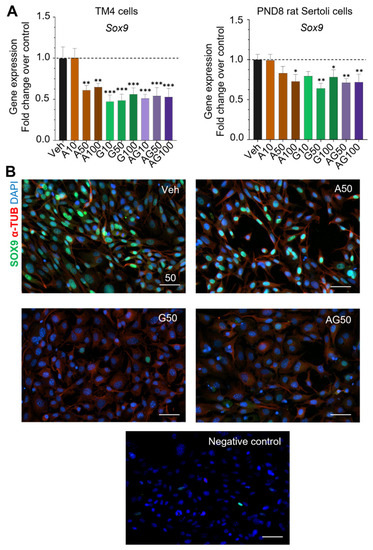 Exposure to APAP and GEN decreases Sox9 expression in mouse TM4 and PND8 rat Sertoli cells. (A) Sox9 mRNA expression analyzed by qPCR after 24 h treatment with APAP (A), GEN (G), and their mixture (AG) at 10, 50, and 100 µM was observed in TM4 and PND8 rat Sertoli cells cultured in CS-FBS supplemented media. Each condition was performed in triplicate in three independent experiments and plotted as mean ± SEM. A one-way ANOVA, multiple comparisons; * p ≤ 0.05; ** p ≤ 0.01; *** p ≤ 0.001. Dashed line indicates the level of vehicle controls (value of 1.0). (B) Representative pictures of Sox9 protein IF signal (green) in TM4 cells after 24 h treatment with vehicle (Veh) or 50 µM APAP and GEN, alone or mixed. Negative control was obtained using only a secondary antibody. Cytoplasm was labelled using α-tubulin IF signal (red), contrasting with Sox9 and DAPI (blue) nuclear localization. Scale bars: 50 µm.