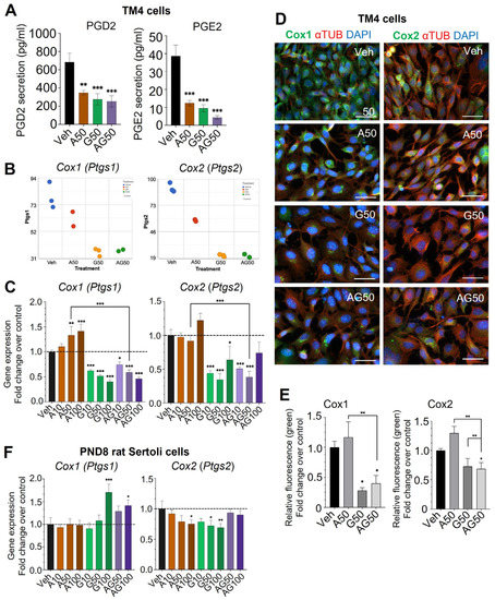 APAP is known to inhibit Cox activity and decrease PG synthesis in some tissues and cells, including adult human testis [27]. Similarly, GEN was reported by us and others to alter Cox enzymes and PG synthesis in spermatogonia and prostate cancer [13,28]. Thus, we postulated that it could also be the case in Sertoli cells. Indeed, both APAP and GEN reduced the levels of PGD2 and PGE2 secreted by TM4 cells treated for 24 h with 50 µM APAP and GEN, alone and as mixtures, with GEN exerting stronger inhibitory effects. PGD2 was reduced by 49% with APAP, 60% by GEN, and 63% by the mixture, respectively (Figure 5A). APAP decreased PGE2 by 68%, GEN reduced it by 75%, and their mixture exerted the strongest inhibitory effects, with an 89% decrease of PGE2, of 4.4 pg/mL of PGE2 secreted by treated cells compared to control levels at nearly 40 pg/mL (Figure 5A). Noticeably, PGD2 concentration in control TM4 cell supernatants was 18 times higher than that of PGE2, although the transcript of Ptges was eight times higher than that of Ptgds in TM4 cells (Figure 3D), suggesting that the levels of enzymes and/or activities did not match the levels of synthase transcripts. Measurement of PGD2 and PGE2 concentrations in TM4 cells cultured in a medium with 10% REG-FBS (with higher PG contents) showed a similar inhibitory trend when exposed to 50 µM APAP or GEN alone and as mixtures (means ± SEM of PGD2 Veh: 1254 ± 379; A50: 337 ± 27; G50: 214 ± 1; AG50: 62 ± 17; means ± SEM of PGE2 values, Veh: 70 ± 18; A50: 28 ± 4; G50: 10 ± 0.2; AG50: 5 ± 0.7 for cells in Reg-FBS).