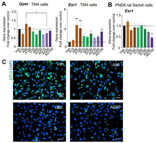 Effects of APAP and GEN on the expression of estrogen receptors in TM4 cells and PND8 rat Sertoli cells. (A) Gper and Esr1 gene expression in TM4 cells (B) and Esr1 in rat Sertoli cells after 24 h exposure to APAP and GEN alone or mixed at 10, 50, and 100 µM. Data are the means ± SEM of three experiments, each performed in triplicate for each condition. A one-way ANOVA, multiple comparisons; * p ≤ 0.05; ** p ≤ 0.01; *** p ≤ 0.001. Dashed lines show the level of vehicle controls (value of 1.0). (C) Representative pictures of immunofluorescent staining of ER-α (green) in TM4 cells treated with 50 µM of APAP, GEN, or the mixture. DAPI (blue) nuclei staining. Scale: 50 µm.