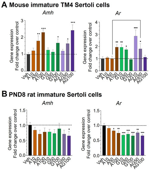 Expression of immature Sertoli cell marker Amh and mature Sertoli cell Ar in TM4 and PND8 Sertoli cells in response to APAP (A), GEN (G), and their mixtures (AG). Gene expression was analyzed by qPCR. Data are expressed as means ± SEM of three experiments with each condition performed as triplicate. A one-Way ANOVA with multiple comparisons. * p ≤ 0.05; ** p ≤ 0.01; *** p ≤ 0.001. Dashed lines indicate the level of vehicle control (value of 1.0).