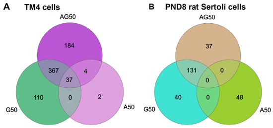 Differentially expressed genes in TM4 cells and PND8 Sertoli cells treated with 50 µM APAP (A), GEN (G), and APAP + GEN (AG) mixture. RNA-seq analysis was used to analyze the transcriptomes of immature TM4 cells and PND8 rat Sertoli cells treated with APAP and GEN alone or mixed. Venn diagrams display statistically significant differentially expressed gene (DEG) counts using false discovery rate or p-value ≤ 0.05 with a cutoff range of −2 to +2 in Partek Flow.