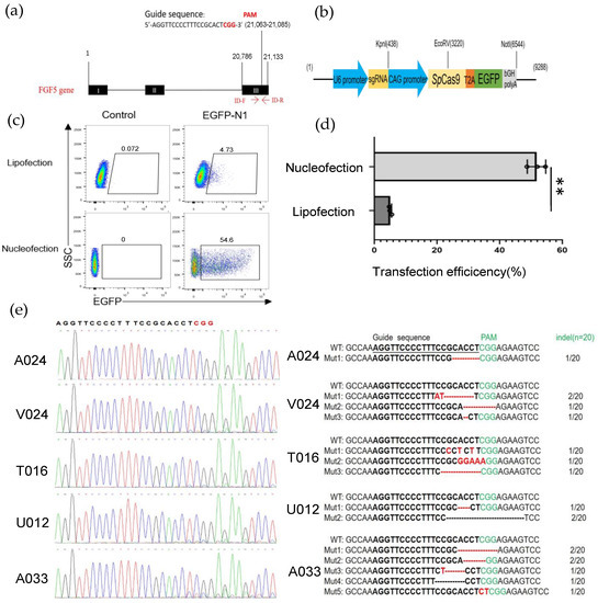 Establishing an efficient nucleofection method in GFFs. (a) Schematic of genome editing at the FGF5 locus; (b) the construction of sgRNA-Cas9 expression vector; (c) detection of the transfected efficiencies of lipofection and nucleofection by flow cytometry after 2 days transfection; (d) effect of the efficiencies of lipofection and nucleofection after 48 h transfection by a histogram, (n = 3 biological replicates). Significance was calculated using t-test: ** p < 0.01; (e) TA cloning and Sanger sequencing analysis of the mutation types and indel frequencies determined in GFFs transfected with Cas9 plasmid. Deleted nucleotides are shown by a dashed line (-), and fresh-added nucleotides are emphasized by red letters. Indel rates are behind the bases.