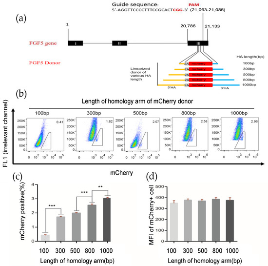 Effects of different length homologous arms on homologous repair efficiency. (a) Schematic outline of mCherry HDR donor with FGF5 locus homologous arms ranging from 100–1000 bp in length; (b) determination of the HDR efficiency by FACS. The percentages of mCherry+ cells represent the HDR efficiencies; (c,d) HDR efficiency and mean fluorescence intensity with different HA lengths. n = 3 biological replicates; ** p < 0.01; *** p < 0.001.