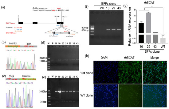 Construction of goat GFF single-cell clones expressing rhBChE at the FGF5 locus via HR. (a) Experimental outline and schematic of the HR process. Both FGF5-sgRNA/Cas9 plasmid and HR arm-CMV-rhBChE template were co-transfected into GFFs; (b) Sanger sequencing of the 3′ junction regions (CMV-rhBChE) upon correct targeting at the FGF5 locus. The orange area shows the HR template before the FGF5 DSB site; (c) Sanger sequencing of the 5′ junction regions (CMV-rhBChE) upon correct targeting at the FGF5 locus. The green area shows the CMV promoter after the FGF5 DSB site; (d) the 3′ junction PCR analyses confirming the site-specific targeting in the GFF clones expressing rhBChE by Primer RI-F/R. P, positive mix cell clone; N, negative wild-type clone; others, positive GFF gene-editing clones (5′ junction PCR analyses are shown in Figure S4); (e) identification of full-length rhBChE donor in the GFF clones expressing rhBChE via ID-F/R; (f) detection of expression of rhBChE by cDNA-PCR; (g) the RNA expression of rhBChE in GFF gene-edited single-cell clones; (h) single-cell clones were identified using immunofluorescence assays with rhBChE antibodies and then were observed by fluorescence microscopy. *** p < 0.001.