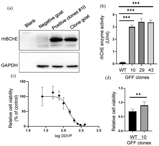 The rhBChE expression and functional analysis of positive GFF clones. (a) Western blot analysis of the rhBChE expression of the #10 monoclonal cell and cloned goat. Negative control, one-month-old WT goat. The clone and WT goat samples were obtained from skin tissue; (b) analysis of supernatant protein activity. The activity of supernatant proteins after ultrafiltration of the different cells was determined by the Ellman assay. Error bars, SD from three technical replicates. Significance was calculated using Student’s unpaired t-test, *** p < 0.001; (c) determination of anti-DDVP ability of WT clone. Next, 145.5 µM was the median lethal dose (MID) of the WT clone; (d) Analysis of anti-DDVP ability of WT and positive clone after 145.5 µM DDVP stimulation. Error bars, SD from three technical replicates. Significance was calculated using Student’s unpaired t-test, ** p < 0.05.