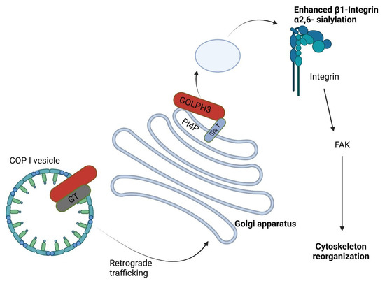 GOLPH3’s role in Golgi protein glycosylation. Several Golgi glycosyltransferases (GT) undergo retrograde trafficking through COPI, which is mediated by GOLPH3. Sialyl-transferase interacts with the GOLPH3 protein and when it is overexpressed, it results in enhanced α2,6-sialylation of β1-integrins. Changes in glycosylation have an impact on the integrin-mediated signaling cascade, which activates FAK (focal adhesion kinase) and causes actin cytoskeleton remodeling and cell movement [4,5,7,23].