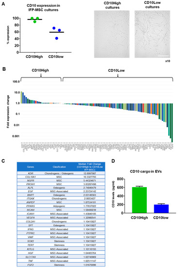 CD10High and CD10Low IFP-MSC cultures, and their molecular profiling. (A) IFP-MSC cultured in regulation-compliant media (Ch-R and hPL) media showed similar fibroblast-like morphology but had 96.5 ± 5.6% for Ch-R and 59.2 ± 15.7% for hPL CD10 expression levels. Magnification ×10. (B,C) Molecular profiling of CD10High versus CD10Low IFP-MSC revealed that 25 out of 90 genes tested were higher expressed in CD10High IFP-MSC, with 8 genes being more than twofold higher (KDR, COL10A1, NGFR, PROM1, ALPL, EGF, BMP7, ITGAX). Interestingly, genes tested were grouped in phenotype-related cohorts with MSC-associated, chondrogenic/osteogenic, and MSC cohorts showing overall the most prominent fold expression change between CD10High and CD10Low IFP-MSC cultures. (D) CD10High EVs had 610 ± 20.6 pg/mL whereas CD10Low EVs had 200 ± 20 pg/mL of CD10 protein as a cargo. Scale bar: 50 μm.