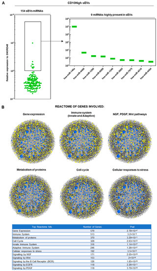 miRNA signature of CD10High sEVs. (A) From 166 MSC-related miRNAs analyzed, 154 miRNA cargos were present in CD10High sEVs. In CD10High sEVs, nine miRNA cargos were predominant (hsa-miR-146a, hsa-miR-4466, hsa-miR-1290, hsa-miR-6089, hsa-miR-1246, hsa-miR-3665, hsa-miR-7975, hsa-miR-4516, hsa-miR-4454). (B) Reactome analysis of miRNAs highly present in CD10High sEVs showed their involvement in the regulation of six gene groups related to gene expression, the immune system, NGF/PDGF/Wnt pathways, metabolism of proteins, the cell cycle, and cellular responses to stress (blue spots: miRNAs detected in sEVs, black spots: genes related to pathways, yellow spots: genes related to pathway that are affected by miRNAs detected in sEVs).