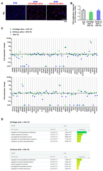 At the molecular level, SYN and TIC culture gene expression was strongly affected by both CD10High and CD10Low sEVs. From 88 genes analyzed, most expression levels were downregulated upon exposure to IFP-MSC sEVs (Figure 5C). Specifically, CD10High sEVs increased the expression level of 45 genes in SYN TIC, with only 13 genes being more than twofold higher (PTGS2, MDM2, EREG, KRT7, IGF1, ESM1, IL15, ITGA4, VIM, POSTN, CSNK1D, CD14, and ALB). Reactome analysis of highly expressed genes in CD10High sEVs/SYN TIC showed their involvement in the regulation of five molecular pathways related to the: regulation of cell population proliferation, cellular response to stimulus, prostaglandin biosynthetic process, regulation of neuroinflammatory response, and regulation of protein phosphorylation (Figure 5D). Also, CD10Low sEVs increased the expression levels of 19 genes in SYN TIC, with only nine genes being more than twofold higher (PTGS2, EREG, MDM2, KRT7, NGF, POSTN, CD14, ESM1, and ITGA4). Reactome analysis of highly expressed genes in CD10Low sEVs/SYN TIC showed their involvement in the regulation of five molecular pathways related to the regulation of cell population proliferation, regulation of protein phosphorylation, cellular response to stimulus, prostaglandin biosynthetic process, and regulation of cellular senescence (Figure 5D).