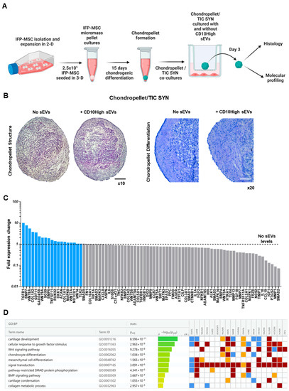 Effects of CD10High sEVs on chondrocytes in vitro. (A) Experimental strategy to simulate a pro-inflammatory microenvironment in vitro by co-culturing MSC-derived chondropellets with inflamed synoviocytes. (B) Chondropellet histological analysis revealed that although CD10High sEVs, treated and non-treated, have similar structure, CD10High sEV treatment resulted in enhanced chondrocyte differentiation and sulfated glycosaminoglycans production in vitro. (C) At the molecular level, CD10High sEV-treated chondropellets showed distinct transcriptional signature with higher expression of 19 genes. (D) Reactome analysis of highly expressed genes in CD10High sEV-treated chondropellets showed their involvement in the regulation of 10 chondroprotection- and cartilage homeostasis-related molecular pathways. Black scale bar: 50 μm, white scale bar: 25 μm.