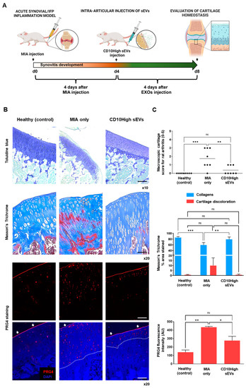 We have previously reported that functionally, IFP-MSC sEVs can significantly reduce synovitis/IFP fibrosis, and also affect macrophage polarization towards an anti-inflammatory therapeutic M2 phenotype in inflammatory conditions in vivo [19]. Herein, an acute synovial/IFP inflammation rat (MIA) model was used to test the chondroprotective capacity of CD10High sEVs upon intra-articular infusion to reverse cartilage degeneration in vivo (Figure 7A).
