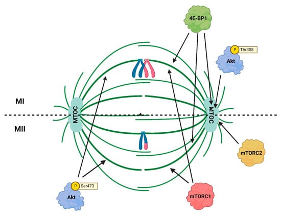 Although phosphorylated Akt is an upstream activator of mTORC1 in somatic cells, it has been suggested that during the meiosis of mammalian oocytes, the Akt pathway is not sufficient for full mTORC1 activation, which is likely to be mediated by CDK1 instead [118]. However, downregulation of the AKT/mTORC1 pathway and its downstream signaling cascades during IVM reduces the quality and developmental potential of porcine and bovine oocytes [58,119]. In MII oocytes, phosphorylated Akt is localized to the MII spindle along with ribosomal protein S6 (RPS6) and 4E-BP1 [48,118]. This suggests that Akt, localized to the MII spindle, regulates the activity of the mTORC1 pathway components.