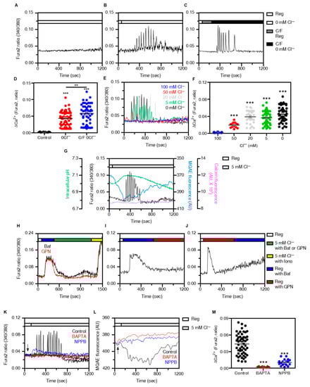 - Luscher, B.P.; Vachel, L.; Ohana, E.; Muallem, S. Cl(−) as a bona fide signaling ion. Am. J. Physiol. Cell Physiol. 2020, 318, C125–C136. [Google Scholar] [CrossRef]