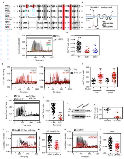TRPML1-mediated Ca2+ release is important for lysosomal fusion in the perinuclear region [16]. Whether the changes in Cl− act as a boosting signal on TRPML1 activation is still unclear. Thus, we evaluated whether TRPML1 possesses a GXXXP motif as a [Cl−]i sensing motif, such as in CLC [10,22], Slc26a6 [23], and NBCe1-B [24]. Analysis of amino acid sequences showed that two GXXXP motifs were present in TRPML1. We constructed GXXXP-mutated TRPML1 mutants, named CBM1 and CBM2 (Figure 3A,B), and determined whether 5 mM [Cl−]e solution increased Ca2+ signaling in TRPML1 CBM1- and CBM2-transfected H1975 cells. To determine the role of TRPML1 on the low Cl−-mediated Ca2+ release, cells were stimulated with the synthetic TRPML1 agonist ML-SA1 [25] in TRPML1 wild type and mutants (CBM1, and CBM2)-transfected H1975 cells. Although ML-SA1 activates all TRPML channels, TRPML1~3 [26], TRPML2, and TRPML3 reveal restricted cytosolic distribution not in late endosomes and lysosomes [27]. Thus, ML-SA1 was treated to activate TRPML1-mediated lysosomal Ca2+ release. Overexpressed Cl−-binding motif mutants, CBM1 or CBM2, revealed that low Cl−-mediated Ca2+ signaling was reduced (Figure 3C,D). Lysosomal Ca2+ channels also include NAADP-induced TPCs [28]. The GXXXP motifs of the TPCs were analyzed in the cytosolic area (Supplementary Figure S3A). The expression of TPC1 was relatively low; therefore, we developed siRNA-TPC2 (siTPC2-a and siTPC2-b) (Supplementary Figure S3B). Knockdown of TPC2 had no effect on low Cl−-mediated Ca2+ signaling (Supplementary Figure S3C). In addition, the GXXXP-mutated TRPM2, GP/AA mutant, had no effect on low Cl−-mediated Ca2+ signaling (Supplementary Figure S3D–F). Additionally, we confirmed the protein expression of TRPML1 mutants (Supplementary Figure S4A,B) and the localization of these mutants was in lysosome as co-localized with LAMP-2 (Supplementary Figure S4C–E). To confirm the channel function of the TRPML1 mutants, ML-SA1 was stimulated in the two mutants. The [Ca2+]i was induced in only 5 mM [Cl−]e solution, whereas both CBM1 and CBM2 were released Ca2+ upon treatment with ML-SA1, (Figure 3E–G). However, the lysosomal pH of all TRPML1 constructs, wild-type and mutant, did not change (Supplementary Figure S4F–I). The ML-SA1 treatment mediated lysosomal Ca2+ release in Ca2+ free (C/F) media, whereas no Ca2+ release occurred in presence of low Cl− (Figure 3H,I). To confirm whether the low Cl−-mediated Ca2+ signaling is mediated by TRPML1, we developed siRNA-TRPML1 and evaluated the expression efficacy of siRNA (Figure 3J,K), which decreases ML-SA1-induced Ca2+ signaling (Figure 3L–O). The low Cl−-mediated lysosomal Ca2+ signaling was decreased by siTRPML1 treatment (Figure 3L–O). In addition, knock-down of TRPML1 decreased low Cl−-induced Ca2+ signaling in the depletion of [Ca2+]ex (Supplementary Figure S5). These results indicated that the GXXXP motif is essential for the Cl− sensing of TRPML1 to release lysosomal Ca2+.