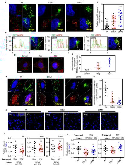 We verified the effect of TRPML1 mutants on lysosomal appearance and cellular migration. Confocal images of TRPML1 mutant-transfected H1975 cells showed enlarged lysosomes, compared to TRPML1 wild-type transfected cells (Figure 4A,B). The fluorescence intensity profiles also showed enlarged lysosomal fraction in the two mutants (Figure 4C). Transcription factor EB (TFEB) is a master regulator that translocates to the nucleus and is involved in lysosomal biogenesis [29]. In the amino acid starvation state, TFEB translocates to the nucleus and coordinates lysosomal and autophagic gene expression [30]. We compared the changes in TFEB expression in culture media, Reg, and low Cl− solution. Enhanced TFEB translocation into the nucleus was observed at low Cl− media (Figure 4D,E). The CBM1- and CBM2-transfected cells showed less translocation of TFEB as compared to that in TRPML1 wild-type transfected cells (Figure 4F,G). These results indicated that the disturbed Cl− sensing motif of TRPML1 mediates lysosomal dysfunction, such as enlarged lysosomes and reduced TFEB translocation. We examined whether the disturbed Cl− sensing ability of TRPML1 affected cellular migration. Cellular migration in the presence of acidic pHe and treatment with ML-SA1 was enhanced and no additive effect on cellular migration was observed in either ML-SA1 or acidic conditions (Supplementary Figure S6A,B). The TRPML1 mutants CBM1 and CBM2 showed reduced migration in Reg compared to wild type, whereas there were no changes in migration in low Cl− solutions compared to wild type (Figure 4H–J and Supplementary Figure S6C,D). These results indicate that the mutated GXXXP motif disturbs the Cl−sensing ability of TRPML1 and reduces the cellular migratory ability.
