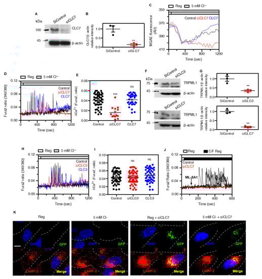 Since CLC7 is expressed in late endosomes and lysosomes and is proposed to be the lysosomal Cl− channel [31,32,33], we evaluated whether depleted lysosomal Cl− channel CLC7 affects TRPML1-mediated lysosomal Ca2+ release. CLC7 knockdown with siRNAs was evaluated based on CLC7 protein expression (Figure 5A,B). Silencing of CLC7 with siRNAs suppressed lysosomal Cl−-induced release of lysosomal Cl− into the cytosol (Figure 5C) and reduced low Cl−-mediated lysosomal Ca2+ release (red traces and dots, Figure 5D,E). Whereas overexpression of CLC7, we observed no changes compared to control in Cl− and Ca2+ measurement (blue traces and dots, Figure 5D,E). To confirm the low Cl−-mediated Ca2+ release through the involvement of CLC7, the role of CLC3, which is broadly expressed, was determined. In contrast to knockdown of CLC7, siRNA-CLC3 has no effect on low Cl−-mediated Ca2+ release (Figure 5F–I). CLC3 knockdown with siRNAs was evaluated based on CLC3 protein expression (Supplementary Figure S7A). Knockdown of CLC7 reduced TRPML1 expression (Figure 5F,G and Supplementary Figure S7B) and lysosomal protein mTORC1 expression (total form and two types of phosphorylated form S2448, S2481 [34]) (Supplementary Figure S7B). Knockdown of TRPML1 reduced mTORC1 expression but did not reduce CLC7 expression (Supplementary Figure S7C). Knockdown of CLC3 also attenuated TRPML1 expression (Figure 5F,G). However, low Cl−-mediated Ca2+ increase was not inhibited by siCLC3 (Figure 5H,I). This result indicated that TRPML1 still existed in knockdown of CLC3. To confirm the reduced TRPML1 expression in siRNA-CLC7 cells, cells were stimulated with ML-SA1 in C/F media. Knockdown of CLC7 suppresses ML-SA1-activated Ca2+ signaling (Figure 5J), suggesting that CLC7 is important for lysosomal Cl− regulation and lysosomal protein expression such as TRPML1. To confirm CLC7 as a lysosomal Cl− path, cells were investigated for lysosomal localization in depleted CLC7. Lysosomal localization in CLC7-depleted H1975 cells was observed in the juxtanuclear region, regardless of Reg or low Cl− stimulation (Figure 5K). These results indicate that CLC7 is involved in the lysosomal Cl− transfer, and knockdown of CLC7 attenuates lysosomal protein expression, such as TRPML1 and mTORC1.