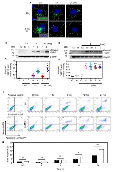 Extended treatment of low Cl−, for which even low Cl−-induced lysosomal Ca2+ signaling is over, decreased migration of H1975 cells. In the long-term application for 12 h and 24 h, lysosomes were depleted which stained with LAMP-2 in comparison with 30 min incubation is presented in Figure 6A. To determine the effect of lysosomal depletion, apoptotic signals was determined. Cleaved PARP, a hallmark of apoptosis [35,36,37], was observed in a time-dependent manner after long-term application of low Cl− solution (Figure 6B,C). The expression of cleaved PARP was enhanced in a Cl− dose-dependent manner (0 mM to 50 mM) in accordance with lysosomal Ca2+ release, (Figure 6D,E). Incubation with low Cl− solution for 24 h increased late apoptosis of H1975 cells in comparison with that of the Reg-treated cells (Figure 6F,G). These results indicate that long-term treatment of low Cl− induced lysosomal depletion and apoptosis.