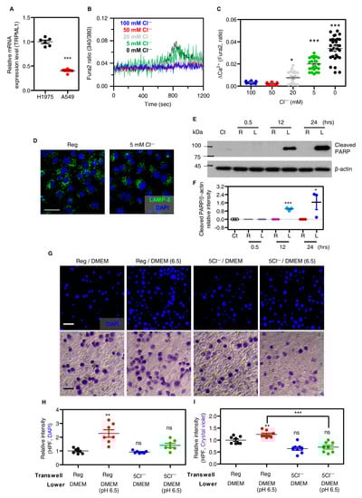 The similar effect of low Cl− on other lung cancer cell A549. (A) The dot plots are presented as means ± SEMs of TRPML1 mRNA expression in H1975 and A549 cells (n = 6, *** p < 0.0001). (B) Changes in [Ca2+]i in A549 cells with various range of Cl− concentration from 0 to 100 mM. (C) The dot plots are presented as means ± SEMs of the relative changes of [Ca2+]i spikes (ΔCa2+, n = 12, n = 13, n = 22, n = 28, n = 32, * p < 0.05, *** p < 0.0001). (D) Images of immunofluorescence staining of LAMP−2 (green) and DAPI (blue) in A549 cells which incubated with Reg and 5Cl− solutions for 30 min. The scale (white) represents 25 μm. (E) Western blotting analysis of cleaved PARP and β-actin in A549 cells incubated with Reg (R) and 5Cl− solution (L) during the indicated time. (F) The dot plots are presented as means ± SEMs of the protein band normalized to β-actin (n = 3, * p < 0.05, *** p < 0.001). (G) Images of transwell migration assay with DAPI (blue) or crystal violet (purple) which were incubated under the indicated conditions in A549 cells. The scale (white for DAPI and black for crystal violet) represents 50 μm. (H,I) The dot plots are presented as means ± SEMs of the relative intensity of DAPI and crystal violet (n = 4, ** p < 0.01, *** p < 0.001, ns; non-significance).
