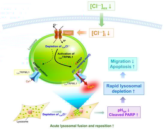 The role of Cl− as a signaling ion in lysosomes is unknown. Notably, we provided evidence that the luminal GXXXP motif of TRPML1 sensed changes in intracellular Cl− acutely (less than 30 min), and subsequent TRPML1-mediated Ca2+ release allows lysosomal movement (Figure 8). Lysosomal repositioning is regulated by various signaling pathways, such as nutrient deficiency [50,51,52], pathologic infection by pathogens [53,54,55], and cellular changes or stresses [56,57,58,59]. We observed dynamic phenomena of lysosomal movement over a short period of time. Without nutrient starvation, perhaps before the recognition of starvation, depleted Cl− is sufficient to drive dynamic lysosomal trafficking with Ca2+ involvement. In addition, low Cl−-mediated acute lysosomal Ca2+ release was used in the juxtanuclear clustering of lysosomes, which is a hallmark of lysosome activation [16]. Acidification of lysosomes and prolonged low Cl− conditions reduced migration and enhanced apoptosis.