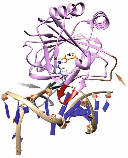- Sundheim, O.; Vågbø, C.B.; Bjørås, M.; Sousa, M.M.L.; Talstad, V.; Aas, P.A.; Drabløs, F.; Krokan, H.E.; Tainer, J.A.; Slupphaug, G. Human ABH3 Structure and Key Residues for Oxidative Demethylation to Reverse DNA/RNA Damage. EMBO J. 2006, 25, 3389–3397. [Google Scholar] [CrossRef]