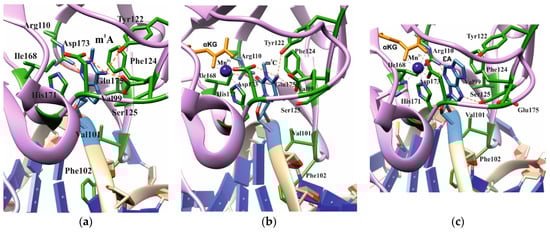 Active-site architecture in the case of m1A ((a), PDB ID: 3BTY), m3C ((b), PDB ID: 3RZJ), or εA ((c), PDB ID: 3RZK). Amino acid residues coming into contact with the damaged base are shown.