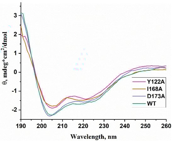 WT ABH2 and its mutants featuring the Y122A, I168A, or D173A substitutions were purified to experimentally evaluate the activity of these enzymes toward DNA containing m3C, m1A, or m5C. First of all, CD spectra of these recombinant proteins were recorded to compare the effects of the chosen substitutions on the structure of the enzyme (Figure 6). The results showed similar structural patterns and allowed us to conclude that the selected substitutions do not cause a global alteration of the secondary structure of the protein.