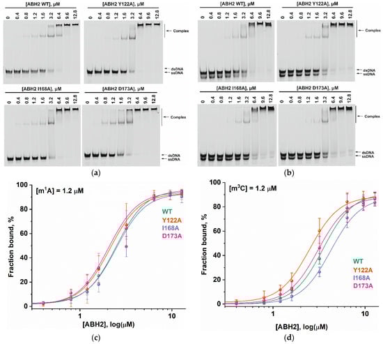 To assess the influence of the amino acid substitutions Y122A, I168A, and D173A on the ability of the enzyme to bind methylated DNA substrates, electrophoretic mobility shift assays (EMSAs) were performed in the presence of 5′-FAM-labeled oligonucleotides containing m1A or m3C as a lesion (Figure 7a,b). The enzymes were titrated with 17-nt dsDNA containing a methylated nucleotide. Equilibrium dissociation constants (Kd) for complexes of the enzyme with target dsDNA (Figure 7c,d) were calculated by means of Equation (1). Dissociation constants were in a narrow range of 2.1–2.7 µM for the binding to the m1A-containing DNA and 2.5–4.2 µM for the binding to the m3C-containing DNA (Figure 8). It should be mentioned that these values are in good agreement with data obtained previously in an equilibrium fluorescent titration assay [].