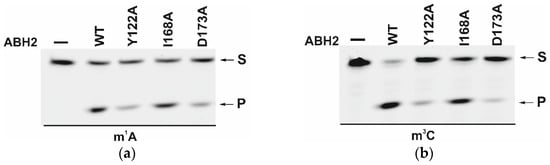 The efficiency of active demethylation of damaged dsDNA substrates by WT ABH2 or its mutant forms Y122A, I168A, or D173A was measured by a restriction-coupled assay followed by gel electrophoresis (Figure 9a,b). The reaction mixture contained equimolar amounts of the enzyme and of its substrate, which was preincubated with Fe2+ ions in the presence of αKG. After 30 min, the reaction was terminated, and the products were digested with a specific restriction endonuclease to cleave the product of the active demethylation. The shortened reaction product was then visualized in a gel, and thus the activity of each enzyme on both substrates, m1A and m3C DNA, was determined.