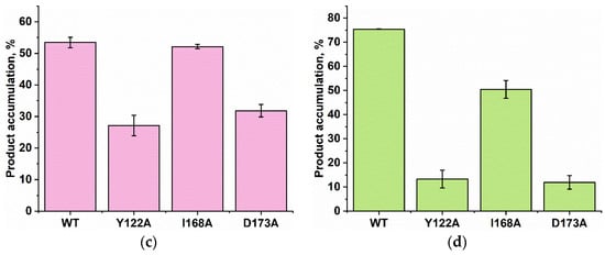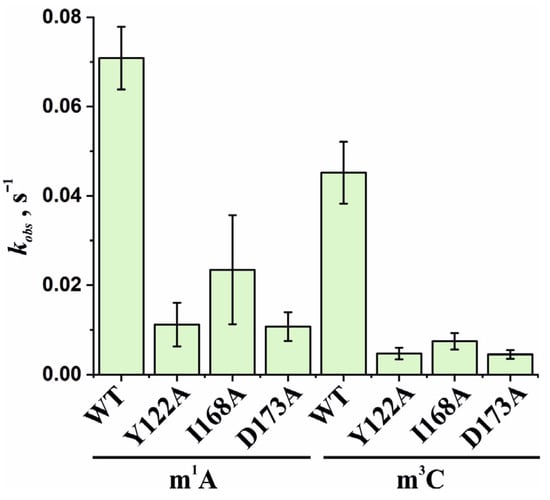 Based on the obtained time courses and the EMSA data, the observed rate constants kobs were determined with the help of Equation (2). The kobs values characterizing the catalytic repair of the m1A- and m3C-containing DNA substrates by WT ABH2 or its mutant forms Y122A, I168A, or D173A are presented as a diagram in Figure 11 and are listed in Table 2. Kinetic analysis revealed that, for the ABH2 I168A mutant form, the kobs values characterizing its catalytic activity toward m1A- and m3C-containing DNA substrates were 4- and 6-fold lower, respectively, as compared to the WT enzyme (Table 2). The kobs values of the m1A demethylation reactions depended on the enzyme and were in the range between 0.010 s−1 for ABH2 D173A and 0.071 s−1 for WT ABH2. As expected, the kobs values for D173A and Y122A (0.013 s−1) variants were very close. Just as in the case of m3C, the kobs values for D173A and Y122A were the lowest in the range, and their difference was within the margin of error (0.0045 ± 0.0009 and 0.005 ± 0.001 s−1, respectively).