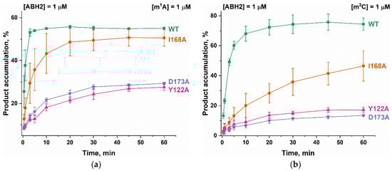 To clarify the details of the impact of the amino acid substitutions on specific features of the reaction of the ABH2 enzyme with the methylated DNA substrates, the kinetics of product accumulation during the active demethylation of DNA substrates containing m1A or m3C by WT ABH2 or its mutant forms were investigated next. Time courses of the substrate demethylation are presented in Figure 10. A comparison of the time courses of the active demethylation of the m1A lesion between WT ABH2 and its mutant forms suggested that, despite similar levels of overall product accumulation, the repair of this lesion by the ABH2 I168A mutant form was slower than that by WT ABH2 (Figure 10a). The substitution of Tyr122 or Asp173 leads to the substantial deceleration of the enzyme, thus reducing the overall efficiency, and the effects are quite similar between the two substitutions, indicating that the effects on the catalytic activity of the ABH2 enzyme are nearly identical when these two amino acids are compared. Moreover, the much lower activity of Y122A and D173A mutant forms toward the m3C lesion was similar to that for the m1A lesion (Figure 10b). The decrease in the initial velocity and overall efficiency of the m3C demethylation by the I168A mutant form was well pronounced but not as dramatic as that seen with substitutions Tyr122 or Asp173.
