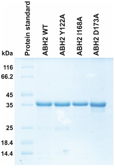 Analysis of protein purity of the WT, Y122A, I168A, and D173A ABH2 enzymes by SDS-PAGE. The proteins were stained with Coomassie Blue R-250 (Sangon Biotech, Shanghai, China).