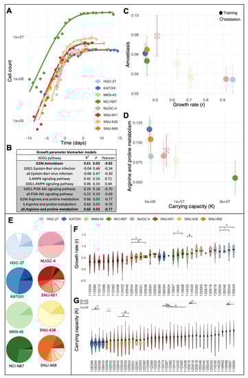 Overall, there was no significant correlation between the growth rate and the carrying capacity across cell lines (Pearson’s , ). In order to investigate the potential r/K trade-offs between clones within a cell line, we sought to find transcriptomic biomarkers of the inferred growth parameters in the scRNA-seq data available from our prior study [22]. Recently, investigators induced r/K-selection in HeLa cells [20]. The authors found that genes that were differentially expressed between r- and K-selected cells cultured at low densities were enriched among 25 pathways defined in the KEGG database [26]. We tested these pathways for their potential as biomarkers of the growth rate and carrying capacity in five of the eight gastric cancer cell lines (further referred to as the training set; Appendix A Figure A2). For each of the 25 pathways, we fitted a linear regression model to predict the growth parameters inferred for a given cell from the cell’s respective pathway activity level. Because the cell cycle is one of the strongest modulators of pathway activity [22,27,28], we also grouped the cells according to their assigned cell cycle state, thereby calculating the median pathway activity across the following: (i) G0G1 cells, (ii) S cells, (iii) G2M cells, and (iv) all cell cycle states combined. The pathways that had the strongest predictive value for the growth rate (r) included the ‘Amoebiasis during G2M’ (adj-), ‘Epstein–Barr virus infection’, and ‘AMPK signaling pathway during S-phase’. For the carrying capacity (K), the ‘PI3K-Akt signaling pathway’ (adj-) and ‘Arginine and proline metabolism’ had the strongest signals (Appendix A Figure A2). This process was repeated to include the remaining three cell lines (further referred to as the validation set), but only for these top performing pathways and cell cycle states (Figure 1B). Of these top pathways, 40% were confirmed in the validation set (FDR adjusted ; Figure 1B), including ‘Amoebiasis during G2M’ and ‘Arginine and proline metabolism’, which were further used as proxies of the growth rate (r) and carrying capacity (K), respectively.